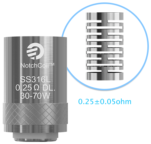 The new NotchCoilTM 0.25ohm DL. (Direct Lung) head lasts longer and can be used under high wattage condition.