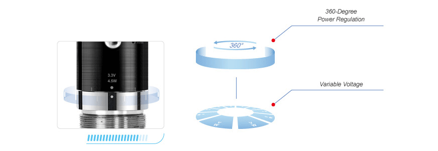 there are four modes of eMode. With VV and VW modes, the voltage and wattage could be adjusted individually by turning the 360-degree power regulation ring. Besides, the RVV and RVW (RVW1, RVW2, RVW3) modes could record the certain data of variable voltage or wattage, which allows you to enjoy different favors.